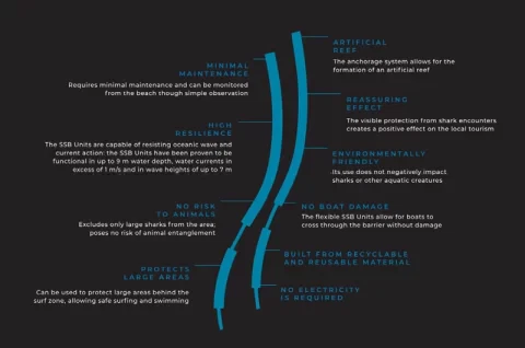 The SharkSafe Barrier™ is non-lethal, eco-friendly, and built to last. It uses magnetic fields and kelp-like structures to safely deter sharks, protects marine life, requires no electricity, and acts as an artificial reef to support ocean biodiversity.